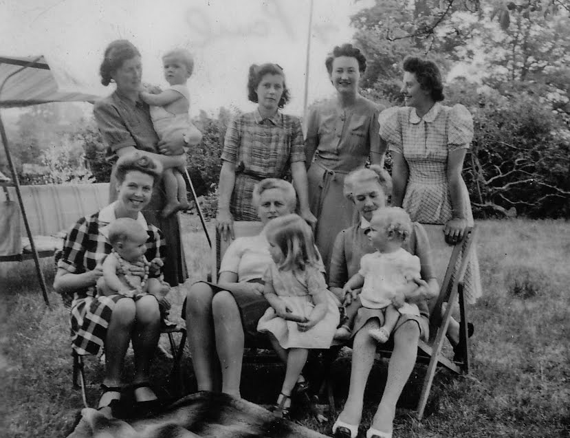 Helen Brown, who has just died aged 99, was, with her husband Watty and daughter Prue, one of our closest neighbours when my parents arrived to live in Wootton Wawen, shortly after I was born. That she was a fine-looking woman can easily be seen from this photograph, taken by my father (I guess) on my first birthday, eight days before D-Day: that's her in the centre of the back row.