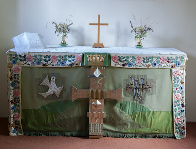 In St Oswald's, Compton Abdale, above the crocodile-mouth water spout, I found this somewhat out of the ordinary altar frontal.